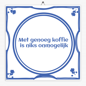 Motiverend en met een goede dosis humor, dit tegeltje is het perfecte cadeau voor een koffieliefhebber. Het geeft de kracht van een stevige bak koffie weer en herinnert je eraan dat niets onmogelijk is om te bereiken. Dit unieke tegeltje staat perfect in iedere koffiehoek. Klik op ´ontwerp tegeltje´ om de mogelijkheden van dit tegeltje te bekijken.