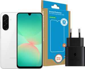 Laad je Samsung Galaxy A26 128GB Wit 5G snel op met de meegeleverde Samsung Oplader 25 Watt Zwart. Binnen 30 minuten zit de batterij voor ongeveer 60 procent vol. Met de BlueBuilt Screenprotector Glas bescherm je het beeldscherm tegen krassen en barsten. De Samsung A26 een instapmodel smartphone met een scherp beeldscherm. Op het 6,7 inch full hd scherm van de Samsung A26 kijk je in hoge kwaliteit naar films op Netflix of video's op YouTube. De Samsung A26 heeft een grote 5.000 mAh batterij. Bij gemiddeld gebruik doe je een hele dag met een volle batterij. Deze Samsung smartphone is geschikt voor gemiddelde taken. Je speelt bijvoorbeeld lichte spellen, luistert naar muziek of gebruikt social media apps. Met de camera's op de achterkant van de Samsung A26 maak je redelijk scherpe foto's. Je bewaart je foto's, apps en andere bestanden op het 128 GB opslaggeheugen.