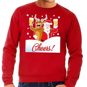 Foute kersttrui dronken kerstman cheers rood heren. De perfecte kerstrui voor een echte bier liefhebber. De sweater is bedrukt met een afbeelding van een dronken kerstman samen met Rudolf. Deze kersttrui/ sweater/ sweatshirt is van dun ongeborsteld katoen en heeft raglan mouwen. Het is dus geen dikke warme trui en kan prima gedragen worden op een kerstborrel of bij het gourmetten. Materiaal: 80% katoen/20% polyester, 240 grams kwaliteit.