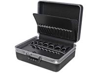 Koffer met diepgetrokken, slagvaste, zwartgenerfde kunststof schaal met stabiel aluminium frame, stof- en regendicht, zuurbestendig en krasvast. De kofferbodem biedt met de variabele tussenschotten...