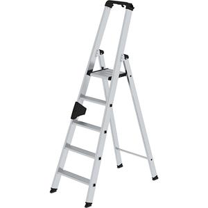 Tredenbokladder, eenzijdig, comfortabele uitvoering met ergo-pad, 5 treden. Levering = gemonteerd. Begaanbaar = eenzijdig. Uitvoering ladder = treden. Treden incl. platform = 5 st. Framemateriaal = aluminium. Tredenmateriaal = aluminium met antislip ribbels. Tredendiepte = 80 mm. Platformhoogte = 1170 mm. Gewicht = 7 kg. Platformbreedte = 250 mm. Platformdiepte = 300 mm. Eigenschap = inklapbaar. Belastbaarheid = 150 kg. Uitrusting = materiaalbakje, veiligheidsbeugel. Verticale hoogte = 1830 mm. Totale hoogte = 1830 mm. Met ergo-pad - ergonomische, antislip handgreep van zachte kunststof voor draagcomfort en een veilige bediening. Aangebracht op het optimale draagpunt voor veilig dragen in het zwaartepunt. Klemmechanisme borgt de ingeklapte ladderbomen. Aangenaam draaggevoel (geen koude handen) door de rubberen ergo-pad. Professionele kwaliteit - uitstekend geschikt voor dagelijks gebruik. Met nivello-voeten - flexibele aanpassing aan de ondergrond. Robuust en stabiel - conisch geleide bomen van rechthoekige buis. Bomen en treden van geëxtrudeerde aluminium profielen. Meervoudig omgebogen. Zeer goed bestand tegen torsie. Afstand tussen treden 235 mm. Vanaf 7 treden met stevige spanbanden. Met ruime materiaalbak. Met ergo-pad voor hoog draagcomfort, een eenvoudige, veilige bediening en antislip nivello-veiligheidsvoeten. N/A