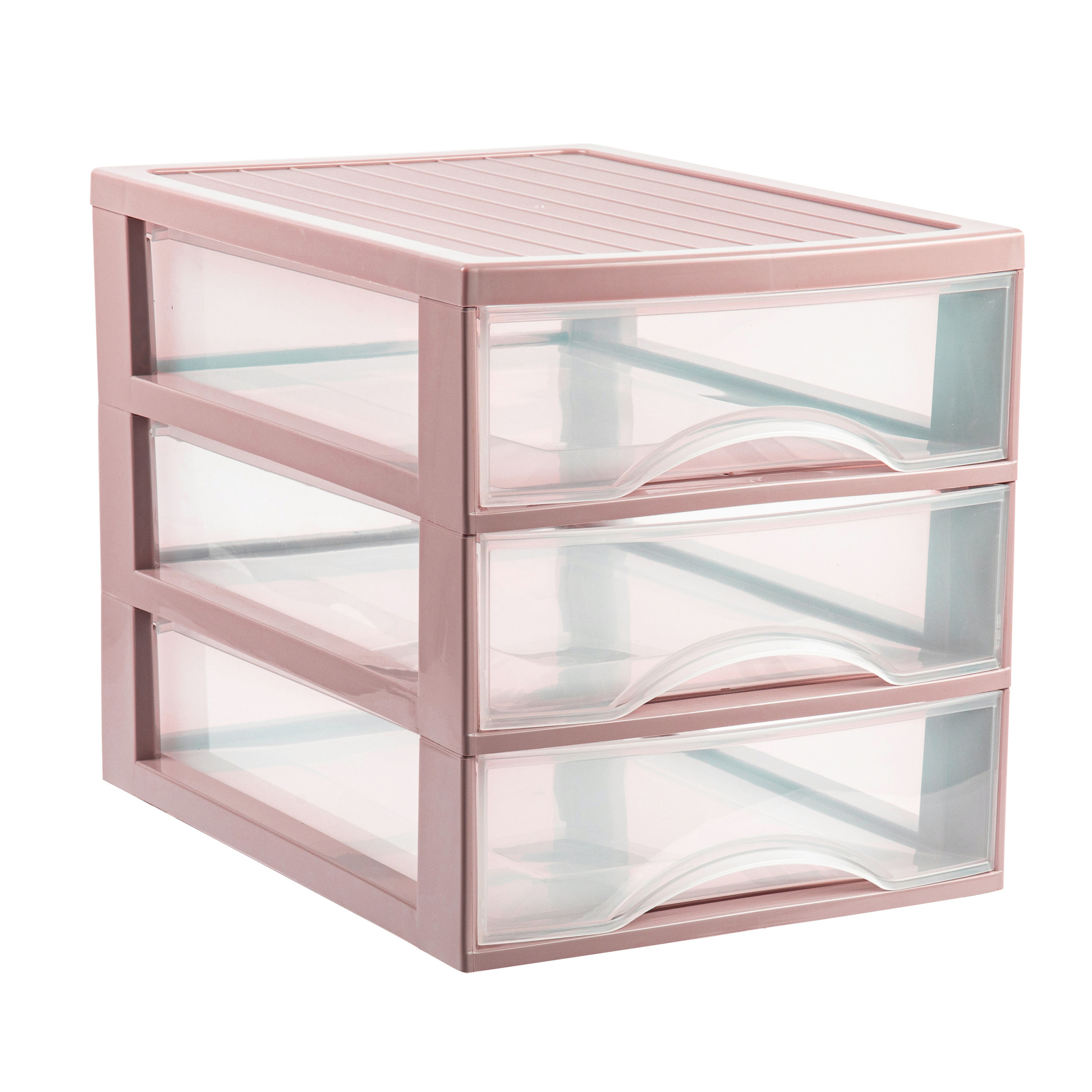 Ladeblokje/kastje, bureau organizer met 3 lades in de kleuren roze/transparant. Een handig ladeblokje om je losse artikelen in op te bergen met roze frame en transparante lades met knop. Ideaal voor op uw thuis kantoor/badkamer om uw spulletjes geordend te houden. Formaat ladeblokje: L26 x B35 x H27 cm. Materiaal: kunststof. Aantal lades/vakjes: 3. Opbergen/opruimen ladeblokken voor kantoor/bureau.