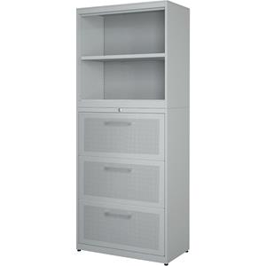 Kastcombinatie met hangmappenladen, breedte 800 mm, front met akoestisch effect, blank aluminiumkleurig / blank aluminiumkleurig. Levering = gedeeltelijk gemonteerd. Hoogte = 1956 mm. Breedte = 800 mm. Diepte = 432 mm. Materiaal = staal, met poedercoating. Producttype = combikasten. Deurkleur = blank aluminiumkleurig RAL 9006. Kastkleur = blank aluminiumkleurig RAL 9006. Aantal legborden = 1 st. Legbordkleur = blank aluminiumkleurig. Aantal hangmappenladen = 3 st. Kastdikte = 0.75 mm. Eigenschap = akoestisch effect. Laden met geperforeerde akoestische front met geluidsisolerende vulling, zeer groot akoestisch effect! Met comfortabel zelfsluitend systeem en sluitdemping. Kastcombinatie bestaande uit een basiselement met 3 hangmappenladen en een open opzetelement. Transparante fronten, zachte sluiting. De voordelige open variant als opzetelement die voor een informele sfeer zorgt. Stevig, gelast stalen kastframe met poedercoating. Standaard met stelpoten. Afdekplaat van staal (11 mm). Met 3 laden, 2 rijen, voor hangmappen in A4 dwars. Smalle metalen handgreep in klassiek-elegante optiek. Laden met dichte bodem op kogelgelagerde, verdekte telescooprails. Volledig uitschuifbaar, belastbaar tot 75 kg. Met dubbele lade-uittrekvergrendeling. Centrale vergrendeling via draaicilinderslot met wisselkern inclusief 2 sleutels. N/A