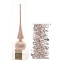 Kerstversiering glazen piek mat 26 cm en sterren folieslingers pakket lichtroze (blush) van 3x stuks. Deze kerstboom versiering bestaat uit 1x glanzende lichtroze piek en 2x lichtroze sterren folieslingers van 270 cm. Materiaal piek: glas. Formaat piek: 26 cm. Formaat diameter slinger: 10 cm. , Dit artikel bestaat uit:, 1x Lichtroze glazen kerstboom piek mat 26 cm, 2x Lichtroze sterren kerstslingers 10 cm breed x 270 cm versiering