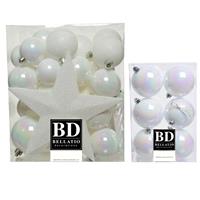 39x stuks kunststof kerstballen met ster piek parelmoer wit mix. Set van onbreekbare kerstballen en ijspegels met een piek/kerstboom topper in stervorm. De set bevat kerstballen en ijspegels van 5 cm, 6 cm en 8 cm met glanzende, matte en glitter afwerking. Onze kerstballen worden standaard geleverd met ophanglintjes maar wij adviseren u om kerstbalhaakjes mee te bestellen. Kerstversiering voor het optuigen van uw kerstboom.Kerstboomversiering/kerstornamenten. , Dit artikel bestaat uit:, 1x Parelmoer witte kerstballen 8 cm kunststof mat/glans, 1x Set van 33x stuks kunststof kerstballen met ster piek parelmoer wit mix