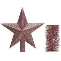 Kerstversiering kunststof glitter ster piek 19 cm en folieslingers pakket oud roze (velvet) van 3x stuks. Deze kerstboom versiering bestaat uit 1x oud roze glitter ster piek en 2x oud roze folieslingers van 270 cm. Materiaal: kunststof/plastic. Formaat piek: 19 x 19 cm. Formaat diameter slinger: 10 cm. , Dit artikel bestaat uit:, 2x Oud roze kerstslingers kerstboom 10 cm breed x 270 cm versiering, 1x Oud roze glitter ster piek kunststof 19 cm