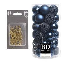 37x stuks kunststof kerstballen donkerblauw 6 cm inclusief gouden kerstboomhaakjes. De set bevat een mix van matte, glitter, golf, cirkel en open kerstballen en 50x stuks gouden haakjes. Kerstversiering/kerstboomversiering/boomversiering. , Dit artikel bestaat uit:, 1x Kerstboom decoratie kerstbalhaakjes goud 50 stuks, 1x stuks kunststof kerstballen donkerblauw 6 cm glans/mat/glitter mix
