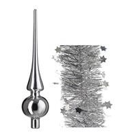 Kerstversiering glazen piek glans 26 cm en sterren folieslingers pakket zilver van 3x stuks. Deze kerstboom versiering bestaat uit 1x glanzende zilveren piek en 2x zilveren sterren folieslingers van 270 cm. Materiaal piek: glas. Formaat piek: 26 cm. Formaat diameter slinger: 10 cm. , Dit artikel bestaat uit:, 1x Zilveren glazen kerstboom piek glans 26 cm, 2x Zilveren sterren kerstslingers 270 cm kerstboom versieringen