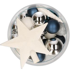 Decoris pakket 33x stuks kunststof kerstballen met ster piek blauw/wit/zilver. De set bevat 5 cm, 6 cm, 8 cm kerstballen, ijspegels en een ster piek. Kerst versiering/decoratie voor het optuigen van uw kerstboom. Onze kerstballen worden standaard geleverd met ophangdraadjes maar wij adviseren u om onze kerstbalhaakjes mee te bestellen (niet inbegrepen).