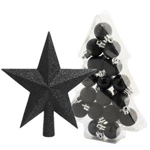 17x stuks kunststof kerstballen 3 cm inclusief ster piek zwart. U ontvangt 17x stuks kerstballen van 3 cm en een ster piek van 19 cm. Onze kerstballen worden standaard geleverd met ophanglintjes maar wij adviseren u om kerstbalhaakjes mee te bestellen. Kerstboomversiering mini kerstballen. , Dit artikel bestaat uit:, 1x Zwarte glitter ster kerstboom piek kunststof , 1x stuks kleine kunststof kerstballen zwart 3 cm mat/glans/glitter