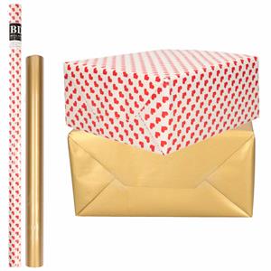 6x Rollen kraft inpakpapier in de kleuren mat goud en wit met een rode hartjes design 200 x 70/50 cm. Cadeaupapier/kaftpapier en verzendpapier. Materiaal: Papier, 70 grams kwaliteit. Papier in rode hartjes design en de kleur mat goud. Dit pakket is een must-have voor elk huishouden. U ontvangt 3 rollen van elke kleur. , Dit artikel bestaat uit:, 3x Inpakpapier/cadeaupapier goud 500 x 50 cm op rol, 3x Inpakpapier/cadeaupapier rode hartjes print 200 x 70 cm