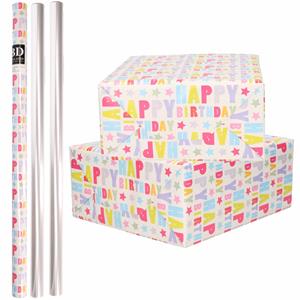 6x Rollen kraft inpakpapier in de kleuren transparante folie en een happy birthday design 200 x 70 cm. Cadeaupapier/kaftpapier en verzendpapier. Materiaal: Papier, 70 grams kwaliteit. Papier in happy birthday design en transparante folie/cellofaan. Dit pakket is een must-have voor elk huishouden. U ontvangt 3 rollen van elke kleur. , Dit artikel bestaat uit:, 3x Transparante folie 70 x 500 cm op rol, 3x Rol kraft inpakpapier Happy Birthday print 200 x 70 cm