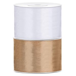 Bellatio decorations 2x rollen satijn sierlint 5 cm x 25 meter goud en wit. Materiaal: polyester met satijnlook. Formaat lint: 25 x 5 x 0,5 cm. Hobbymateriaal benodigdheden satijnlint voor het maken van decoraties of het verpakken van cadeautjes. Cadeauverpakkingen cadeau lint/ribbon satijn verpakkingsmaterialen. , Dit artikel bestaat uit:, 1x Hobby/decoratie wit satijnen sierlinten 5 cm/50 mm x 25 meter, 1x Hobby/decoratie goud satijnen sierlinten 5 cm/50 mm x 25 meter