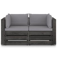 Deze tweezitter is een ideale keuze om te ontspannen en te genieten van het weer, een dutje te doen of met vrienden en familie te kletsen. Dankzij het tijdloze palletontwerp voegt de houten bank een vleugje rustieke charme toe aan je terras, tuin of woonkamer. De pallet bank is gemaakt van geïmpregneerd grenenhout waardoor hij duurzaam, weerbestendig en milieuvriendelijk is. Deze tuinbank heeft een massieve constructie en vergt weinig onderhoud. Gecombineerd met dik gevoerde kussens biedt onze tuinbank het hoogste comfort. Opmerking: om de levensduur van je tuinmeubel te verlengen, raden wij je aan om het meubel regelmatig schoon te maken en niet zonder bescherming buiten op te bergen.Reinigen: gebruik een milde zeepoplossing.Opbergen: indien mogelijk op een koele, droge plaats binnenshuis opbergen. Als het product buiten wordt opgeborgen, bescherm het dan met een waterdichte hoes. Veeg en droog, na regen of sneeuwval, overtollig water of sneeuw van vlakke oppervlakken. Zorg voor voldoende luchtcirculatie om vochtschade te voorkomen. Kleur kussen: grijs Materiaal: grenenhout, grijs geïmpregneerd Materiaal kussen: stof (100% polyester) Afmetingen hoekbank: 69 x 70 x 66 cm (B x D x H) Dikte zitkussen: 6 cm Dikte achter-/zijkussen: 13 cm Montage vereist Levering bevat: 2 x hoekbank 2 x zitkussen 4 x rug-/zijkussen
