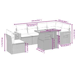 Deze loungeset is de perfecte aanvulling op je tuin of terras en biedt een comfortabele en uitnodigende ruimte om met familie en vrienden te kletsen of gewoon buiten te ontspannen en te genieten. Duurzaam materiaal: PE-rattan, ook wel poly rattan genoemd, is een sterke, onderhoudsarme kunststof die lijkt op natuurlijk rattan. Het is licht van gewicht en gemakkelijk schoon te maken en wordt vaak gebruikt voor tuinmeubelen vanwege de duurzaamheid en weerbestendige eigenschappen.Verstelbaar tafelblad: het tafelblad kan worden opgetild om de tafel te verhogen en hem te veranderen van een salontafel in een eettafel. Hij is perfect om gasten te ontvangen of buiten te eten.Handige bijzettafel: dit tuinmeubel beschikt over een inklapbare bijzettafel met een gasveer op de armleuningen, waardoor je een handige plek hebt om je benodigdheden binnen handbereik te houden.Afneembare en wasbare hoes: deze zitkussens hebben afneembare hoezen, waardoor ze eenvoudig te wassen en te onderhouden zijn.Modulair ontwerp: deze tuinmeubelset heeft een modulair ontwerp, waardoor hij volledig flexibel en gemakkelijk te verplaatsen is. Op die manier kun je een opstelling van tuinmeubilair creëren. Goed om te weten:Om de levensduur van je tuinmeubelen te verlengen, raden wij je aan om de meubelen met een waterbestendige hoes af te dekken. Draagvermogen (per zitplek): 110 kg Uv-bestendig Verstelbare kunstof voetjes Montage vereist: ja Middelste stoel: Kleur: beige Materiaal: PE-rattan en gepoedercoat staal Afmetingen: 55 x 62 x 69 cm (B x D x H) Afmetingen zitting: 55 x 55 cm (B x D) Zithoogte vanaf de grond: 37 cm Hoekzitting: Kleur: beige Materiaal: PE-rattan en gepoedercoat staal Afmetingen: 62 x 62 x 69 cm (B x D x H) Afmetingen zitting: 55 x 55 cm (B x D) Zithoogte vanaf de grond: 37 cm Bank met acaciahouten armleuning: Kleur: beige Materiaal: PE-rattan, gepoedercoat staal en massief acaciahout met olieafwerking Afmetingen: 62 x 62 x 69 cm (B x D x H) Afmetingen zitting: 55 x 55 cm (B x D) Zithoogte vanaf de grond: 37 cm Hoogte armleuning vanaf de grond: 55 cm Afmetingen bijzettafel: 24,5 x 23,5 cm (L x B) Tafel: Kleur: beige Materiaal: PE-rattan, gepoedercoat staal en massief acaciahout met olieafwerking Afmetingen: 100 x 55 x 44/73 cm (L x B x H) Kussen: Kleur: lichtgrijs Materiaal hoes: stof (100% polyester) Materiaal vulling zitkussen: schuim Vulling rugkussen: katoenvezel Afmetingen zitkussen: 55 x 55 x 3 cm (B x D x D) Afmetingen rugkussen: 55 x 45 x 13 cm (L x B x D) Levering bevat: 1 x tuintafel 1 x hoekbank 3 x middenbank 2 x bank met acaciahouten armleuning 7 x rugkussen 6 x zitkussen met afneembare en wasbare hoes
