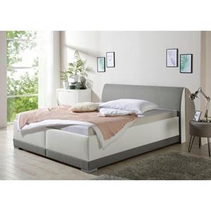 Hoofdbord en onderkant bedkist overtrokken met structuurstof van 100% polyester, boordsel opzij bij het hoofdbord en de bovenkant bedkist van imitatieleer. Hoofdbordhoogte 92 cm, voetenbordhoogte 45