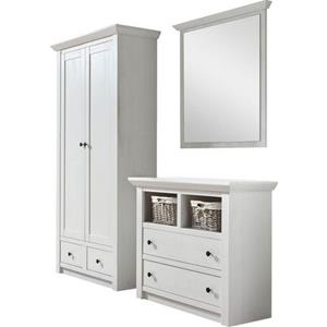 De halmeubelset is van FSC-gecertificeerd houtmateriaal vervaardigd. Bestaande uit een garderobekast, spiegel en een kast met 2 laden en 2 open vakken uit de serie »California«. De gevlochten manden