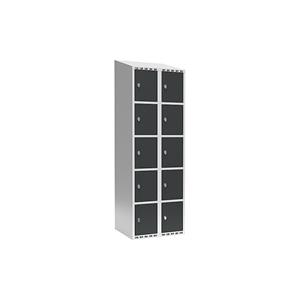 Lockerkast Fydor, 5 vakken, lichtgrijs / grijs, b = 600 mm, 2 compartimenten, schuine bovenkant, hangslot. Levering = gemonteerd. Uitvoering = schuine bovenkant. Hoogte = 1900 mm. Diepte = 550 mm. Breedte = 600 mm. Kastkleur = lichtgrijs RAL 7035. Deurkleur = antracietgrijs RAL 7016. Sluiting = draaivergrendeling met voorziening voor hangslot. Aantal afdelingen = 2 st. Aantal vakken = 5 st. Afdelingsbreedte = 300 mm. Materiaal = staal, met poedercoating. Type deur = vleugeldeur. Aantal sleutels = 2 st. Constructie = gelast. Oppervlak = gelakt. Sterke garderobekast met een grote keuze aan afmetingen, kleuren en toebehoren. Perforaties voor optimale ventilatie. Duurzame functionaliteit dankzij gepoedercoat staal. Ideaal voor magazijnen, werkplaatsen, sportclubs, openbare faciliteiten en nog veel meer. Verschillende dakvormen en afsluitopties. Twee sleutels per slot. Met de Fydor-serie krijgt u een klassieke maar moderne volledig gelaste kledingkast. De kast maakt indruk met zijn hoge kwaliteit en veiligheid. Volledig gelast frame met gladde bodem maakt de kast gemakkelijk te reinigen. Perforaties voor ventilatie aan de zijkanten en sleuven onder en boven de deur zorgen voor een goede luchtstroom. De lockerdeuren zijn voorzien van dubbele verstevigingen in de lengte, rubberen stootranden en gelaste deurstoppen om bestand te zijn tegen dagelijkse slijtage. Een praktische en betaalbare lockerkast voor uw kleedruimte of pauzeruimte die u helemaal aan uw wensen kunt aanpassen. Kies uit verschillende afmetingen, combinaties, kleuren, sokkels en kasttoebehoren. Als u in ons standaardassortiment niet vindt wat u zoekt, neem dan contact op met onze klantenservice. Wij helpen u graag om alternatieven te vinden die passen bij uw behoeften.