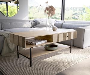 Sein filigranes Gestell mit klarer Linienführung prägt den modern minimalistisch anmutenden Charakter dieses Couchtisches. Pulverbeschichtetes Metall sorgt für die nötige Stabilität. Der Tisch Nereos - Stilvoll und filigran mit praktischem PlatzangebotEin Highlight des Designs ist die attraktive Ausstrahlung des hochwertig verarbeiteten Massivholzes. Mit seiner natürlichen Maserung wirkt das hier verwendete Holz der Mango inspirierend, dynamisch und elegant. Alle Produktdetails im ÜberblickProduktmaße:Maße ca.: B130 x T60 x H51 cmMaße Schublade: B65,5 x T24 x H11 cm (x2)Maße Fach 1: B54,5 x T60 x H14,5 cmMaße Fach 2: B104,5 x T45,5 x H15,5 cm Produktmaterial:Korpus: MangoFuß: Metall Produktfarbe:Korpus: White WashedFuß: SchwarzOberfläche:Korpus: Glatt,versiegeltFuß: PulverbeschichtetWeitere Details:Montagehinweis: teilmontiertGewicht in kg: 28Hinweis: es handelt sich hierbei um ein Naturprodukt, das natürlichen Schwankungen und optischen Veränderungen unterliegen kann, Astlöcher und andere Einschlüsse oder Unregelmäßigkeiten im Material sind ebenfalls natürlich,