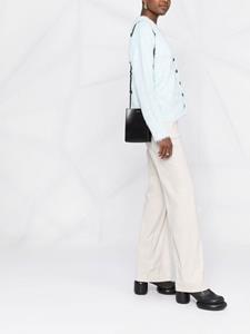 Zwart, leer, logoprint op de voorkant, magneetsluiting , enkele gedraaide schouderband en hoofdvak.