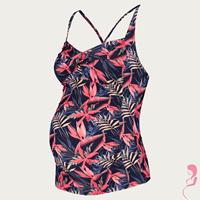 Tropische sferen in deze zwangerschapstankini top Bella. Ideaal voor tijdens de vakantie of je wekelijkse zwemmomenten. Met sportief gekruisde bandjes aan de achterkant.Past bij broekje Bodi met zelfde design.