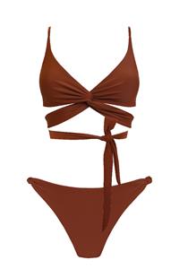 Ein mühelos raffiniertes Bikini-Set mit geschmeidigen, innenliegenden Nähten, die bequem deinem Körper folgen. Das Wickel-Bikini-Oberteil hat verstellbare Spaghetti-Träger und kann einfach um gewickelt oder vorne gedreht und dann vorne oder hinten mit einem selbstgebundenen Knoten geschlossen werden. Die slim Bikinihöschen sind mit hochgeschnittenem Bein und brasilianischer halber Rückenbedeckung entworfen. Das doppelt recycelte Material sorgt für eine lang anhaltende Qualität. Hergestellt in Polen aus nachhaltigeren Materialien. Weil wir darauf bestehen, dass persönlicher Stil nicht die Welt kosten sollte. Material 78% ECONYL Recyceltes Nylon 22% Elastan Features & Fit • Selbstbindende Wrap-Around-Passform • Unterstützung kommt von der Kompression Dieses Oberteil passt aufgrund der Form der Cups nur bis zu einem C-Körbchen. Orientiere dich an deiner Unterbrustweite, um deine perfekte Oberteilgröße zu finden. • Wenn du zwischen zwei Größen wählst, wähle danach, ob du etwas mehr/weniger Oberweite und etwas mehr/weniger Push-up möchtest. • Wenn du es anprobierst, vergewissere dich zuerst, dass die Träger des Bikinioberteils die richtige Länge haben, damit die Rückenteile an die richtigen Stellen kommen, und wickle es dann eng um dich. Es sollte sich beim ersten Mal etwas eng anfühlen, da es so einen guten Halt hat und im nassen Zustand etwas weicher wird. Das Unterteil ist so konzipiert, dass es höher auf den Hüften sitzt, näher an der Taille. Wenn du es vorziehst, sie tiefer auf den Hüften zu platzieren, wähle eine Nummer größer.