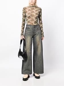 Marineblauw, katoen, denim, kleurverloop, logopatch aan de achterkant, wijde pijpen, knoopsluiting en traditioneel 5-zakkenmodel.