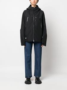 Zwart, logopatches aan de voorkant, logopatch op de mouw, logopatch aan de achterkant, opstaande kraag, tweeweg ritssluiting aan de voorzijde, lange mouwen, klassieke capuchon, zakken met ritssluiting aan de voorkant en gebogen afwerking aan de achterkant.