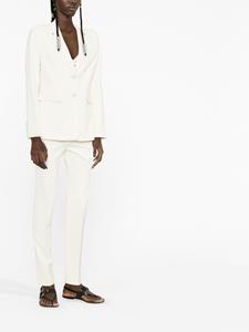 Licht beige, gekartelde revers, turkoois steen, knoopsluiting aan de voorkant, lange mouwen, opgestikte steekzak en twee klepzakken aan de voorkant.