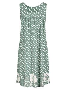 Soepel vallende jerseyjurk met aantrekkelijke print. Dubbellaags afgebiesde ronde hals en armsgaten. Met 2 opgestikte zakken en mooie rimpelingen.