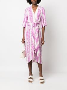 Optisch wit, orchidee paars, all-over slangenprint, geknoopt detail, V-hals, driekwartsmouwen, verborgen ritssluiting op de rug, asymmetrische zoom en lengte tot onder de knie.