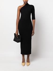 Zwart, ribgebreid, asymmetrisch, enkele driekwart mouw, midi-lengte en rechte zoom. Dit product bevat meer dan 50% gecertificeerde van hout afgeleide materialen. Deze materialen zijn gecertificeerd, wat betekent dat ze afkomstig zijn uit verantwoord beheerde bossen die ontbossing tegengaan en zorgen voor een eerlijk loon en arbeidsmilieu, behoud van biodiversiteit en gemeenschapsrechten.. .