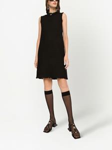 Zwart, goudkleurig logo, ronde hals, mouwloos, gerafelde afwerking, rechte zoom en verborgen ritssluiting op de rug.