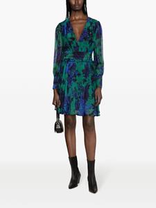 Smaragdgroen, kobaltblauw, zijden chiffon, semi-doorzichtige laag, all-over bloemenprint, medaillon hanger, ruche details, V-hals, ballonmouwen, knoopmanchetten, elastische tailleband, rechte zoom en dijlengte.
