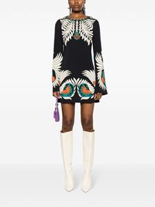Zwart/veelkleurig, stretch design, all-over grafische print, ronde hals, lange mouwen, verborgen ritssluiting op de rug, dijlengte en rechte zoom.