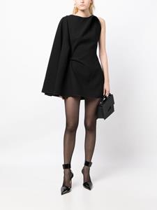 Gitzwart, asymmetrisch design, ronde hals, verborgen haak- en ritssluiting aan de zijkant, enkele gedraaide schouderband, cape design, lange gedrapeerde mouwen, getailleerde taille, rechte zoom, dijlengte en ongevoerd.