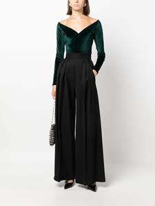 Bosgroen, fluweel, gekruiste hals, plunge stijl en lange mouwen.