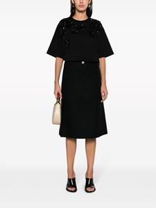 Zwart, A-lijn, high-waist, knoopsluiting aan de voorkant, verborgen sluiting aan de voorkant, achtersplit, knielengte en rechte zoom.