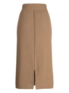 Karamelbruin, lamswol, kasjmiermix, gebreid materiaal, fijngebreid, high waist, achtersplit, elastische tailleband, rechte zoom en midi-lengte.