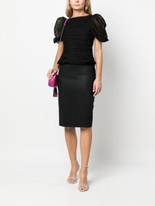^circa 1990 zwart/grijs wol krijtstrepen kokerrok verborgen ritssluiting op de rug mid waist split aan de achterkant knielengte rechte zoom