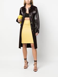 circa 2010 goudgeel katoenblend kokerrok verborgen ritssluiting op de rug high waist knielengte rechte zoom split aan de achterkant