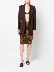 Karamelbruin, koffiebruin, dierenprint, imitatiebont ontwerp, high waist, verborgen ritssluiting aan de zijkant, koker silhouet, rechte zoom en knielengte. . .