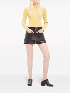 zwart lamsleer zilverkleurig materiaal mid waist gespsluiting aan de voorkant ritssluiting aan de voorkant twee opgestikte voorzakken rechte zoom dijlengte
