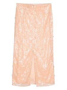 bloemenkant detail rechte zoom volledige voering split aan de achterkant verborgen haak- en achterritssluiting aan de achterkant high waist zandbeige enkellengte verfraaid met kralen pailletten