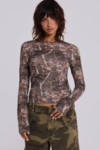 Woodland Long Sleeve Jersey fabric with soft hand feel All over woodland camo print True fit with slightly cropped body Twisted side seam detail Central back seam detail Model is 5 ft 10 and wears a size XSStyle code: JMT4774100% Cotton30 Degree Machine WashCool Iron on reverseLay flat to dryWash inside out