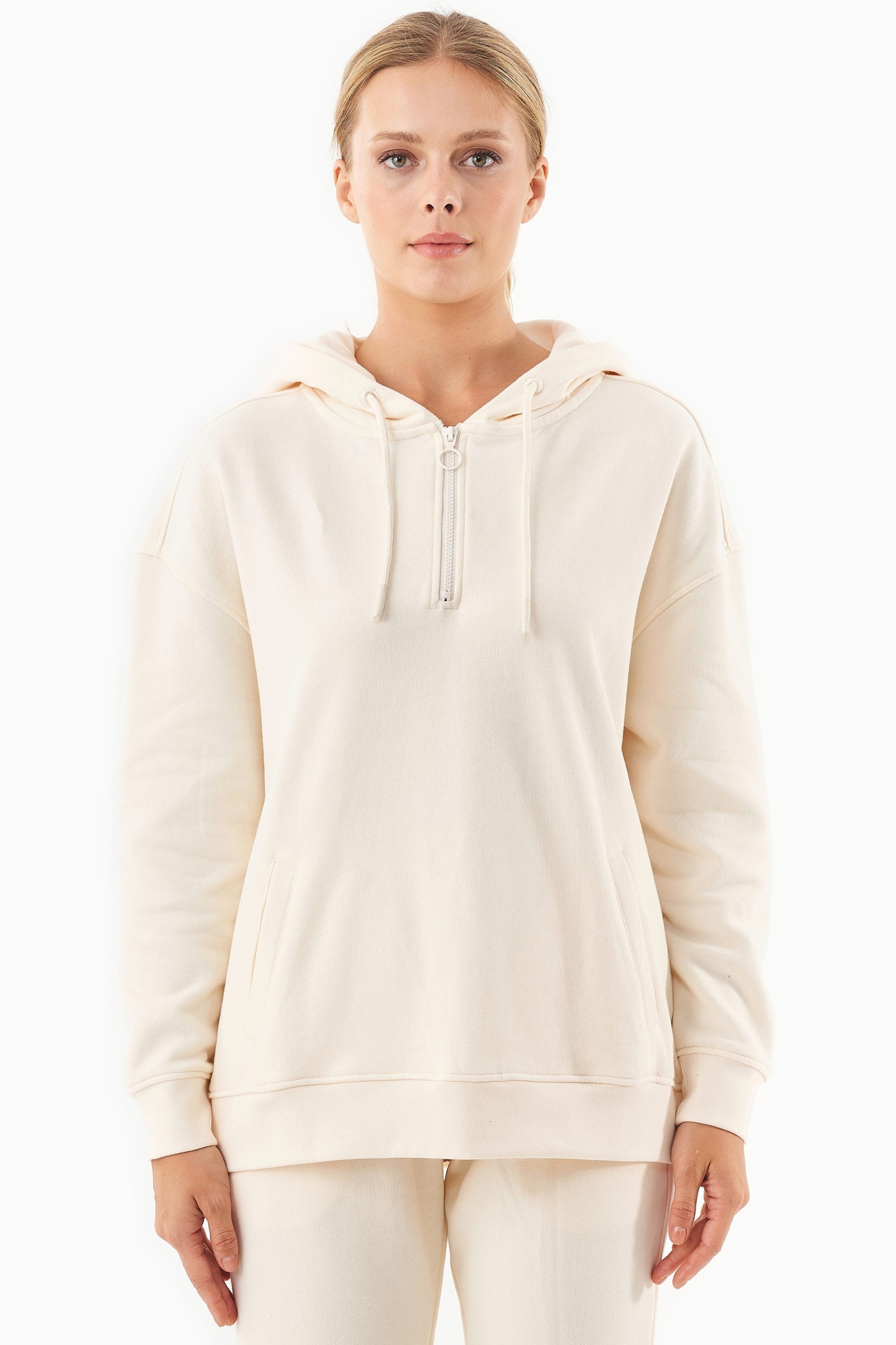 Passform: normale Passform Kragen: Kapuze Ärmellänge: Langarm Kapuze mit Kordelzug Mit Viertelreißverschluss Mit Fronttaschen Bündchen und Saum gerippt Aus carbon brush sweat Material: 100 % Bio-Baumwolle Unser Model ist 1,76 m groß und trägt Größe S