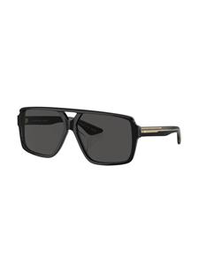 Zwart, acetaat, oversized montuur, grijze glazen, rechte pootjes en gebogen uiteinde. Deze bril wordt verkocht met een beschermhoes..