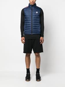 Marineblauw, gewatteerd design, logopatch aan de voorkant, gestreept detail, twee zijzakken met ritssluiting, ritssluiting aan de voorkant, hoge hals, mouwloos en rechte zoom.