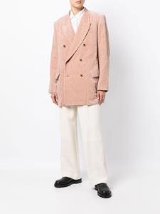 Rose roze, katoen-linnenmix, fluwelen effect, sluiting met dubbele rij knopen, opstaande revers, twee klepzakken aan de voorkant, Amerikaanse split aan de achterkant en rechte zoom.