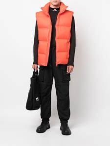 Lichtoranje, eendenveren, gewatteerde vlakken, hoge hals, ritssluiting aan de voorzijde en mouwloos.